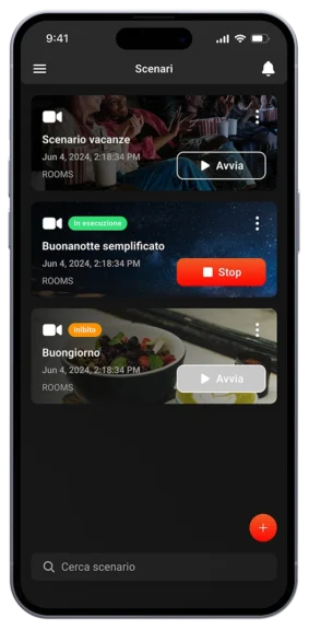 Con un solo comando gestisci più funzioni: ad esempio “Uscita” spegne le luci, abbassa le tapparelle e attiva l’allarme.